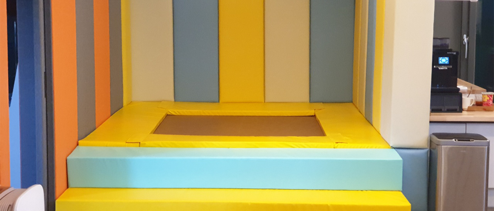 어린이를 위한 수영장 미끄럼틀과 트램펄린